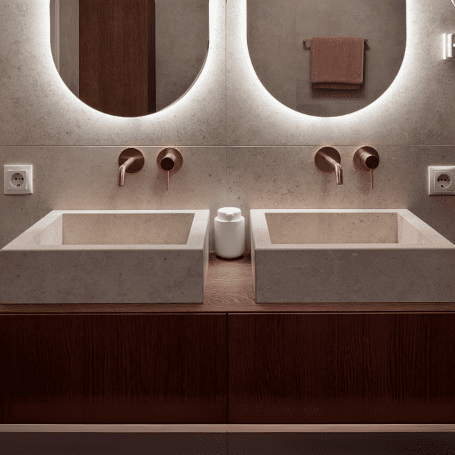 Door de roségouden details en designspiegels krijgt de badkamer een luxe uitstraling. De pastelkleurige tinten zorgen voor een rustige en serene sfeer, waardoor je je zo in een spa waant.