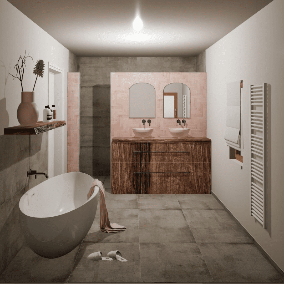 Met de visualisatiemogelijkheden van tegenwoordig kunnen wij jouw ruimte 3D intekenen, zodat de tegel of tegelcombinatie, maar ook de textuur van de gekozen tegels, alsnog helder wordt. Daarnaast kunnen we ook het gekozen sanitair of jouw maatwerk meubel intekenen. Indien gewenst kun je het volledige ontwerp zelfs bekijken in Virutal Reality!