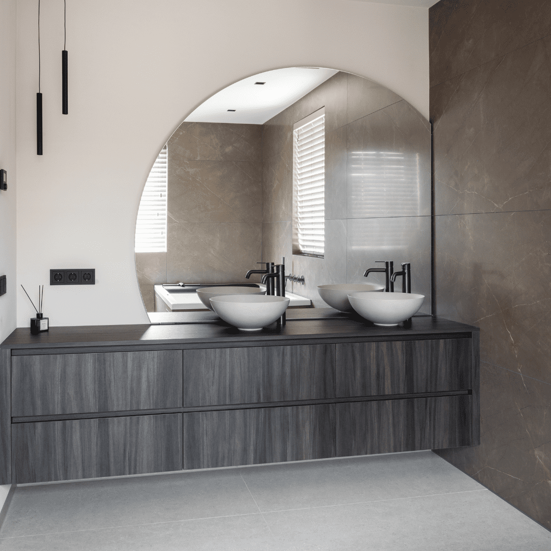 In de badkamer en het toilet hebben we gekozen voor chique grootformaat marmerlooktegels in een warme bruintint. Op de vloer ligt dezelfde tegel als op de begane grond, maar dan nét een tintje lichter – zo blijft alles mooi in balans en vormt het één geheel. De natuursteen mozaïek in de nis geeft een speelse touch. En zie je dat prachtige maatwerk meubel met die opvallende spiegel? Dat maakt het plaatje helemaal af!